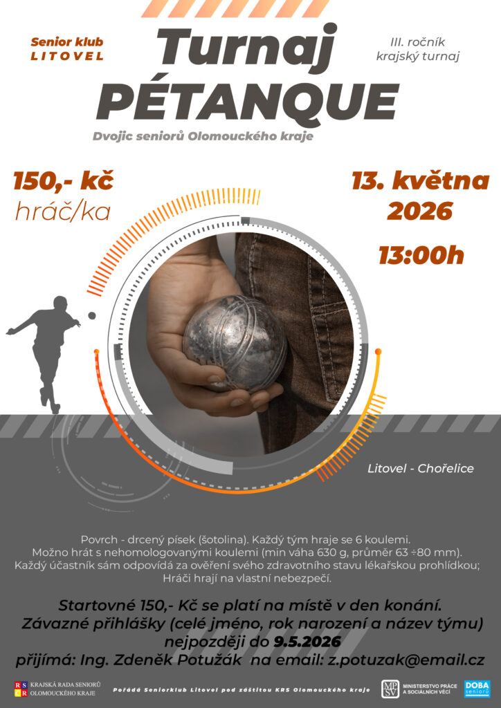 Tentokrát si přijdou na své příznivci Pétanque. Krajská rada seniorů Olomouckého kraje ve spolupráci se Seniorklubem Litovel pořádá každoročně krajský turnaj v Pétanque