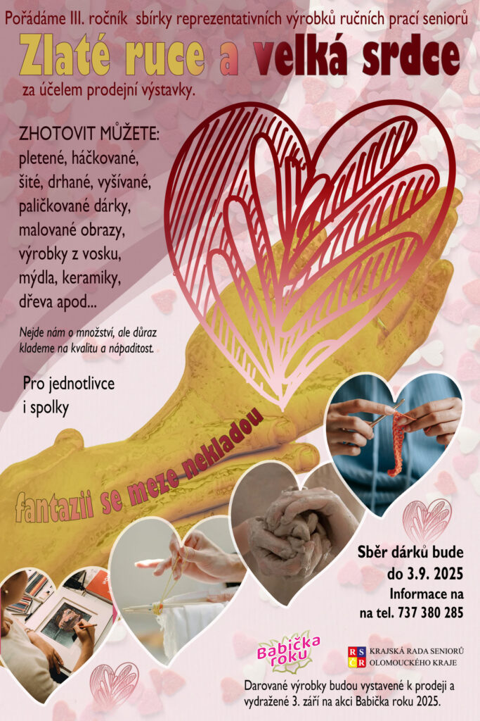 Součástí této soutěže je také krásný projekt Zlaté ruce, velká srdce. Prosím všechny zlaté ruce s velkým srdcem, kteří věnujete své výrobky k prezentaci , kontaktujte paní Janu Absolonovou na tel. 737 380 285. Případný výtěžek bude věnovat na charitativní účel KRS Olomouckého kraje, o kterém vás budeme informovat. Za všechny darované výrobky předem děkujeme.